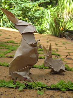 I'm half-way through reading 'Watership Down' by Richard Adams. My mind has since become deeply and happily entangled within the lives of the rabbits, their adventures and their quest for mischief. So, thus, is my origami inspired... perhaps this is Hazel-rah and Fiver, grazing on Watership downs, as Hazel ponders a 2nd raid on Efrafa :)